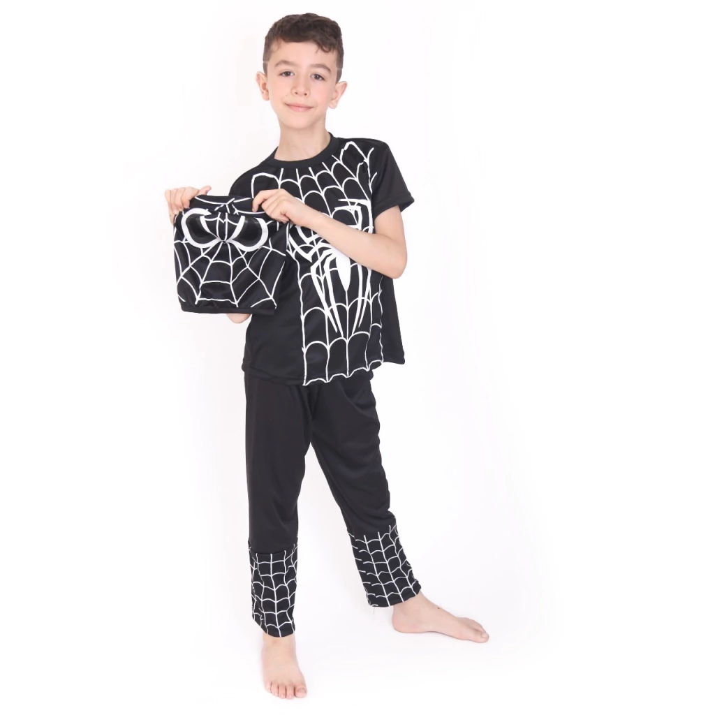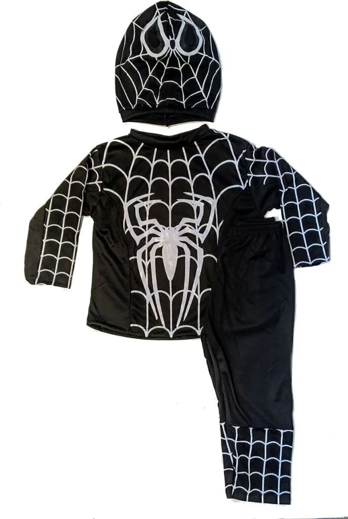 Disfraz infantil Venom (Spiderman negro) re cómodo y canchero! Consta de 3 piezas: remera de mangas largas o cortas (según temporada) estampada, pantalón con detalle en el ruedo y máscara tipo capucha estampada. No olvides recortarle los orificios para los ojos!